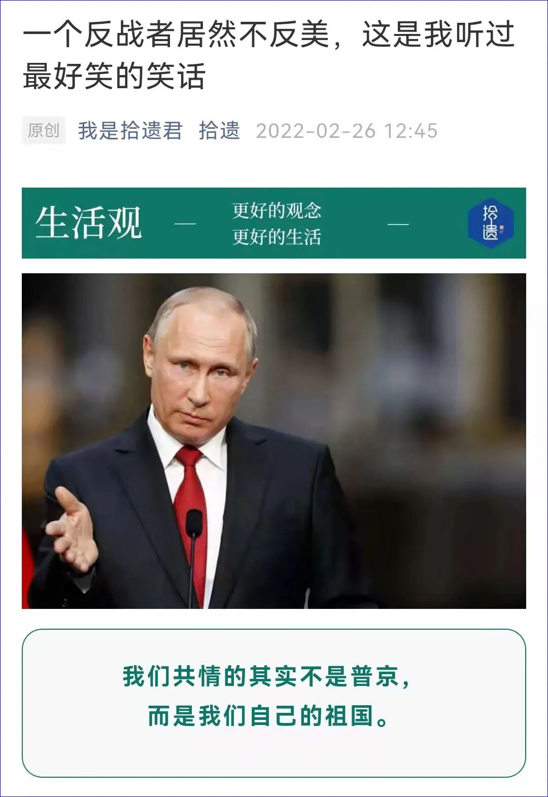 这个作者就更牛了,在“反战不反美,心里必有鬼”的基础上更进了一步,把“共情普京”和中国扯到了一起。
