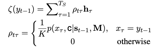 例子:假设Tony这个词出现在两个字典的交集部分,那么它的score就不只是传统的Generate-mode计算方式,同时还要计算Copy-Mode对应的score,那么相比别的只出现在V集合中的词,它的可能性会更大。再比如Jebara这个词,如果V中没有包含这个生僻的单词,那么传统做法下它会被映射成<UNK>,但是有了Copy-Mode,由于它在source中出现过,那么它会按照浅紫色部分获得score,从而被copy出来。具体的计算公式如下: