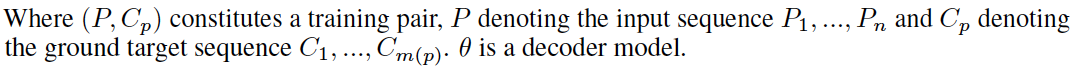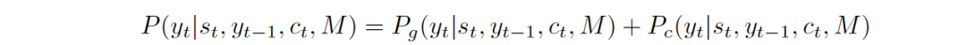 其中t为时间步长。St是解码器隐藏状态,yt是被预测的token。ct和M分别表示编码器隐藏状态的加权和和编码器隐藏状态。g和c分别为生成模式和复制模式。