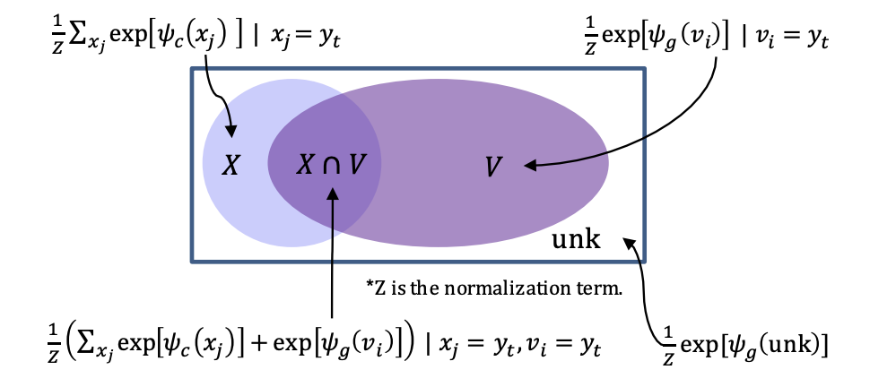 如图上,深紫色部分代表的是事先加载好的词表,传统做法是不属于其中的token都当做<UNK>处理。在本篇文章中,作者将训练样本中的source部分切字/词构成了X集合,由此便出现了上图的浅紫色圆圈。每个部分都对应有分数(score)的计算方式,整个合在一起进行归一化。