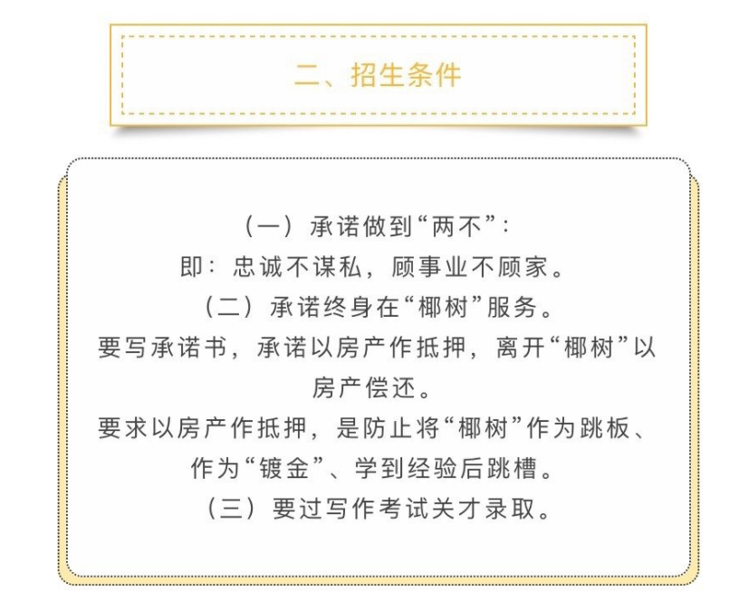 其实,去年8月,椰树集团也曾为“职业经理学校”公开招生。其中,招收条件中提到,应征者需遵守两点承诺才能被录取,一要承诺做到“两不”:忠诚不谋私,顾事业不顾家;二要承诺终身在“椰树”服务,承诺以房产作抵押,离开“椰树”以房产偿还。