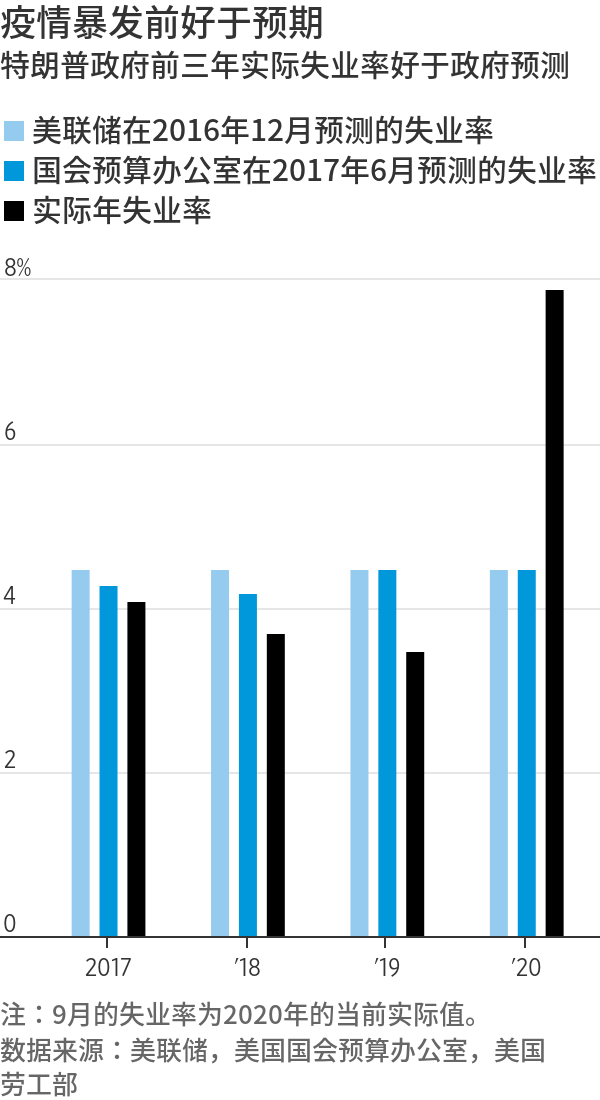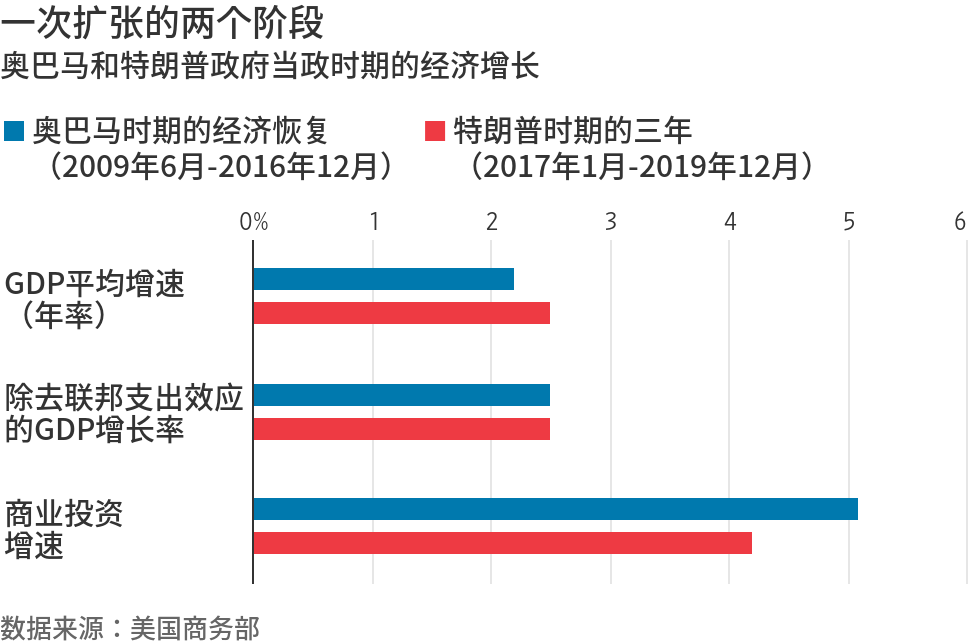 在奥巴马政府领导下的经济扩张期,美国国内生产总值(GDP)平均每年增长2.25%。根据美国商务部的数据,在特朗普执政的头三年里,增长率升至2.5%。特朗普的顾问们在采访中表示,奥巴马未能带来通常在经济扩张初期出现的繁荣,而他们帮助在经济扩张末期创造了繁荣。