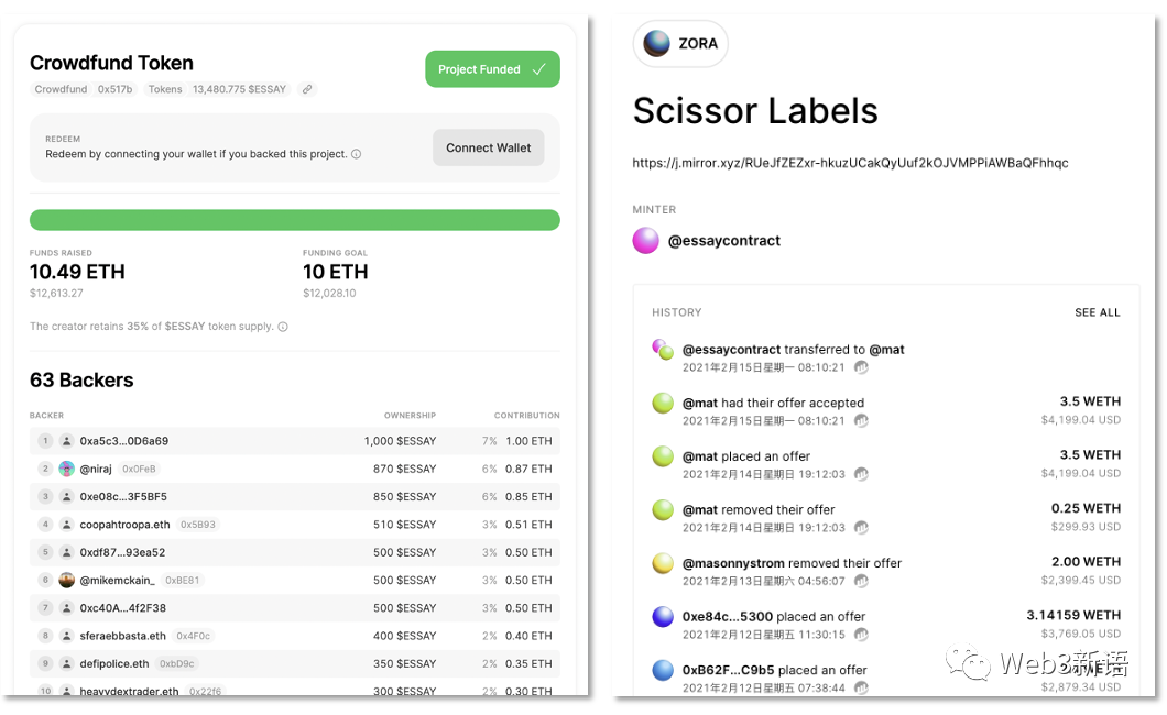 产品兼软件工程师约翰·帕尔默是第一个在j.Mirror.xyz上发起作品众筹的会员,众筹发表了一篇名为Scissor Labels的文章。他创建了一种$ESSAY加密代币作为股权发放,最终筹集了10.49以太坊(约12613.27美元)。这篇文章被铸造成NFT并在Zora上拍卖,最终以3.5 WETH(目前约4198.39美元)的价格拍出。