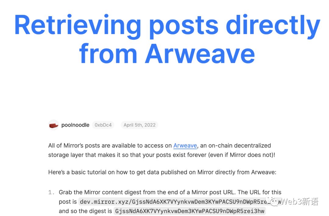 功能缺失。Mirror并没有提供查找文章或作者的功能,也没有阅读量、订阅量等后台统计数据,信息展示和传播的角度还远不及Web2产品。但是严格上来讲这并不能算是Mirror的缺点。虽然Mirror没有提供搜索功能,却在官方博客上发布了在Arweave上搜索数据的教程。简单来讲就是,Mirror并不是做不了这些功能,他就是非要让其他人来分这一杯羹,这样一来Mirror的生态也就顺势起来了。这就是小新在开头提到的,Web3世界是一个开放的生态,Mirror作为一款Web3产品,他只提供底层的工具服务,而把在Mirror之上的创业机会留给了其他团队。