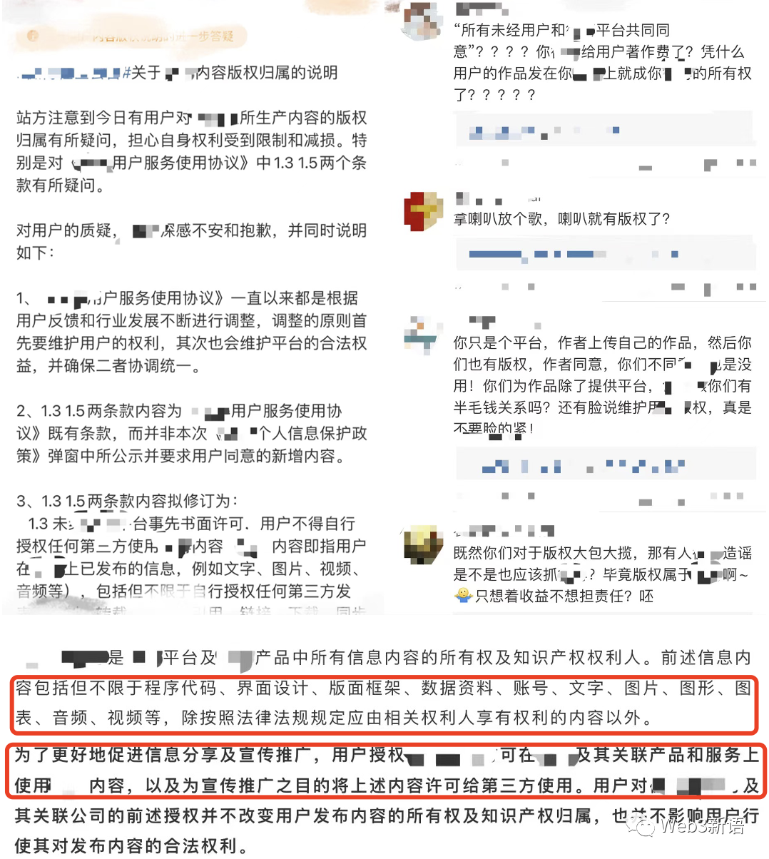 平台所有。小新翻阅了几个平台的用户协议和作者协议,目前各大平台已经不敢在协议里明确要求取得作品的所有权和独家版权,但是我们依然能从互联网上找到蛛丝马迹。过去的自媒体平台仗着大部分用户容易忽略用户协议的习惯,以强取豪夺的方式制定各种侵占条款,这当然激起了不小的民愤。随着用户版权意识增强,各平台才逐渐收敛。但是从协议里我们依然能看到各平台在强行要求取得用户数据的使用权。