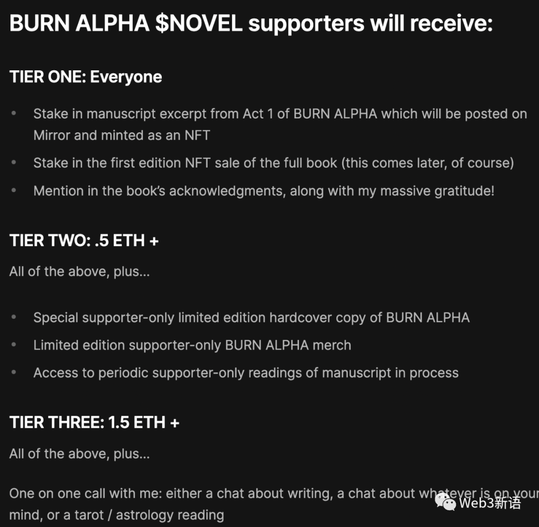 创作者可以引入激励元素来加速众筹完成,例如作家艾米丽·赛格尔为她即将出版的小说“BurnAlpha”发起的众筹项目设立了3档福利门槛:任何支持者都有机会参与该书的NFT拍卖,质押0.5ETH以上可获得限量版精装本和 BURN ALPHA 商品,质押1.5ETH以上可以得到一对一会面的机会。项目最终筹集了24以太坊(目前约28789.92美元)。引入激励元素可以让项目的超级粉丝和顶级支持者从众多投资者中脱颖而出。