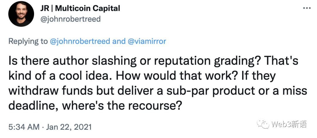 众筹项目没有交付保障。小新目前没有看到Mirror对于众筹作品设置类似交付标准的限制。一个众筹项目如果以高质量的期望募集资金却交付了低质量的作品,无异于非法集资,将会给支持者们造成损失。小新在官方推特的评论里看到有用户提出建议,可以对创作者信用进行分级,如果出现交付低于预期或跑路的情况直接扣信用分。