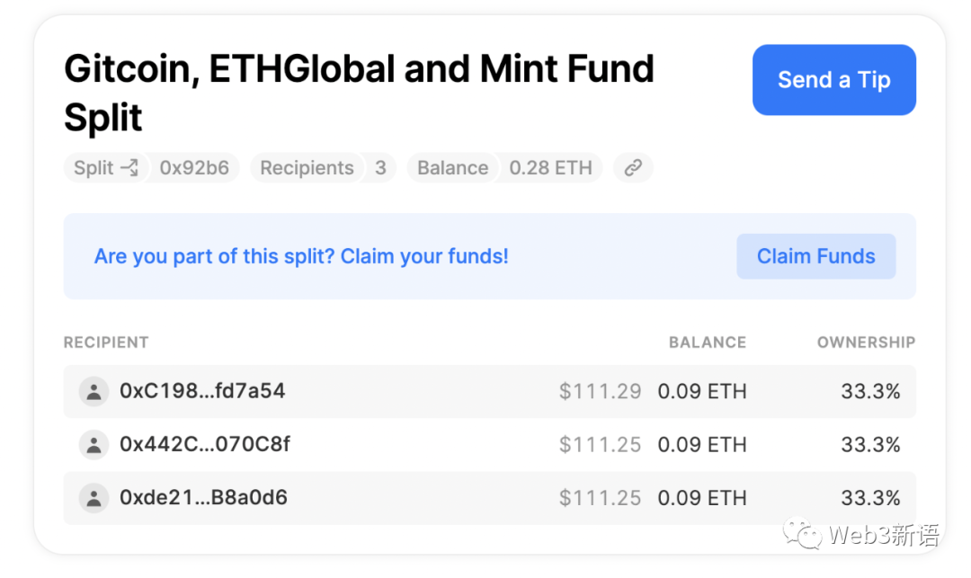 Split适用于解决任何项目权益分配的问题。创作者可以创建一个Split,添加其他以太坊地址作为贡献者(类似论文中的共同作者),只要事前制定好分配规则(例如下图中将 NFT 拍卖收益的 50% 分配到自己的钱包,将另外 50% 分配给 Gitcoin、ETHGlobal 和 Mint Fund Split),事后的收益可以由智能合约来自动执行。