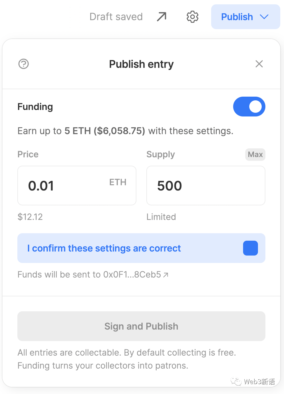 Mirror发布的特色在于,每一篇发布的文章都可以被铸造成NFT,这意味着创作者可以将代表一篇文章的稀缺NFT作为独特的收藏品或艺术品出售。如果创作者在发布时采用默认配置(NFT默认价格为0,供应上限为500个),就可以免费发布作品(免费是指Mirror不收取任何费用,创作者仍然需要支付Arweave存储费,每篇约 0.00005 AR/0.000249 美元)。创作者也可以自行设置作品NFT的价格和供应量,这样收藏者就成了作品的赞助人,有机会在潜在的增值收益中获得分红。