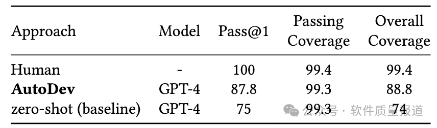 值得注意的是,这个结果是在没有额外训练数据的情况下获得的,这将AutoDev与LATS区分开来,后者达到了94.4%。此外,AutoDev框架将GPT-4性能从67%提升至91.5%,相对提升了30%。这些结果体现出,AutoDev有能力显著提升大模型完成软件工程任务方面的表现。4.2 AutoDev在测试生成任务中的效果如何?AutoDev在针对测试生成任务修改的HumanEval数据集上,获得了87.8% Pass@1分数,与使用相同GPT-4模型的基线相比,相对提高了17%。AutoDev生成的正确测试(包含在Pass@1中)实现了99.3%的鲁棒覆盖率,与人工编写的测试的99.4%覆盖率相当。![]()