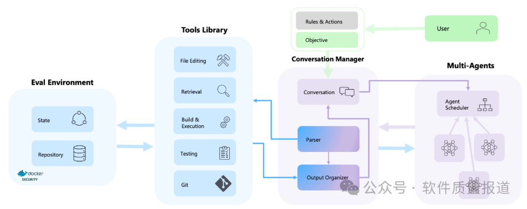 解析器(Parser)解释由智能体生成的响应,以预定义格式提取命令和参数。它确保指令格式正确,验证参数的数量和准确性(例如,文件编辑命令需要文件路径参数)。如果解析失败,错误消息将注入对话中,从而阻止对存储库的进一步操作。通过执行特定的智能体权限和进行额外的语义检查,进一步分析成功解析的命令。它确保建议的操作符合用户指定的细粒度权限。如果命令通过审查,对话管理器将在工具库中调用相应的操作。2.2.2 输出组织器