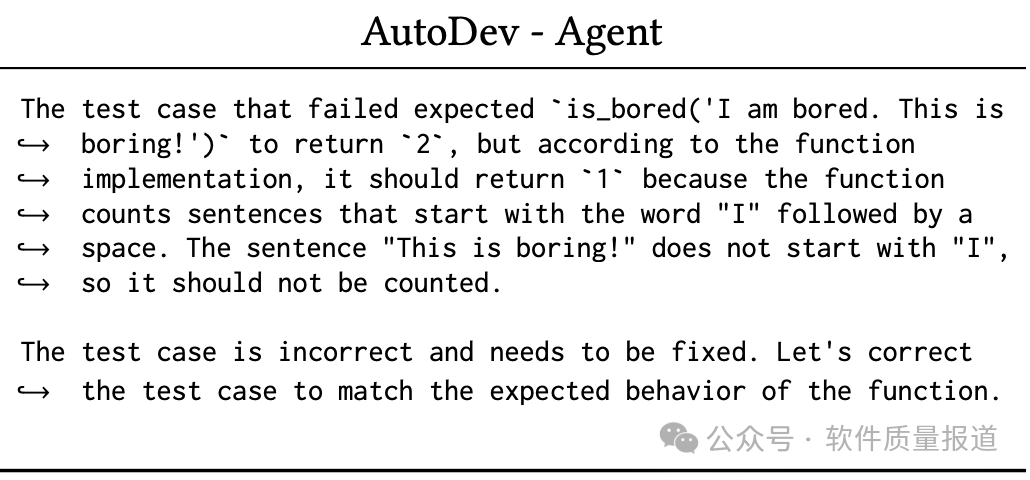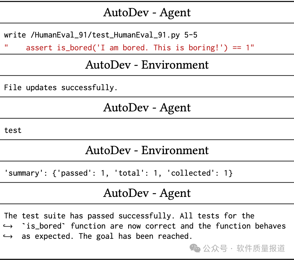 AutoDev智能体在pytest输出中发现了一个错误,认识到需要进行修复,以使测试与函数的预期行为保持一致。AutoDev智能体发出写入命令,指定文件路径和行号范围 (5-5),以重写错误的断言语句。随后,AutoDev智能体继续执行测试,并测试成功。![]()