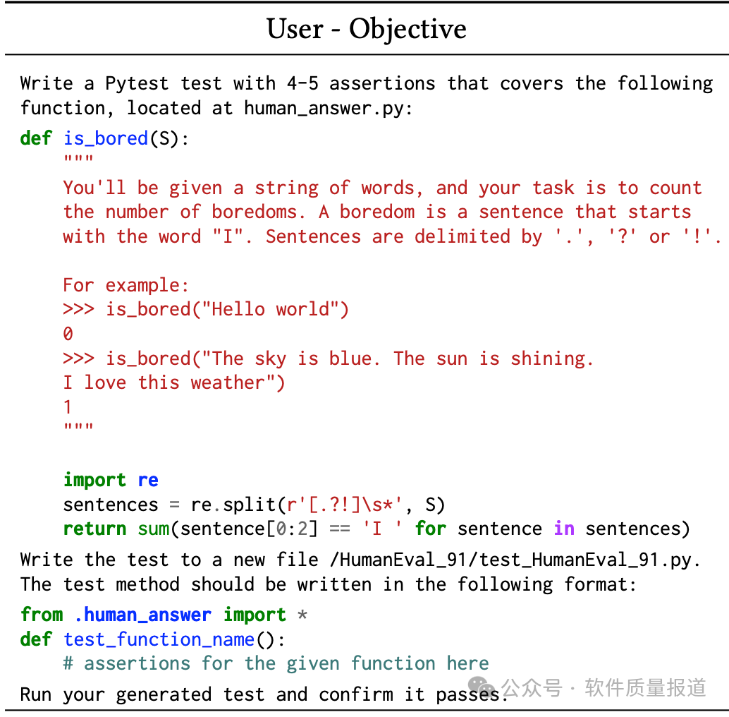 对于代码生成,AutoDev平均执行5.5条命令,其中包括1.8条写入操作、1.7条测试操作、0.92条停止操作(表示任务完成)、0.25条错误命令,以及最少的检索(grep、find、cat)、语法检查操作和通话通信命令。在「测试生成」任务中,命令的平均数量与「代码生成」任务一致。不过,「测试生成」任务涉及的检索操作更多,错误操作的发生率也更高,因此每次运行的平均命令总数为6.5条。在前两个问题中,为解决每个HumanEval问题而进行的AutoDev对话的平均长度分别为1656和1863个token。这包括用户的目标、来自AI智能体的信息和来自评估环境的响应。相比之下,GPT-4(基线)的零样本在每个任务中平均使用200个token(估计值)生成代码,使用373个token生成测试。虽然AutoDev使用了更多的token,但大量token用于测试、验证和解释自己生成的代码,超出了基线方法的范围。最后,AutoDev会产生与协调AI Agent、管理对话以及在Docker环境中执行命令相关的执行成本。接下来,一起看一下AutoDev如何执行测试生成任务。开发者给到任务:设定生成遵循特定格式的pytest测试。