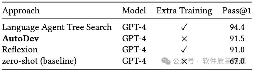4.1 AutoDev在代码生成任务中的效率如何?表1显示了,将AutoDev与两种替代方法和零样本基线进行了比较。研究人员将AutoDev与语言智能体树搜索(LATS)和Reflexion 进行了比较,这两种方法是截至2024年3月HumanEval 排行榜上的两种领先方法。零样本基线(GPT-4)的结果取自OpenAI GPT-4技术报告。AutoDev Pass@1率为91.5%,在HumanEval排行榜上稳居第二。