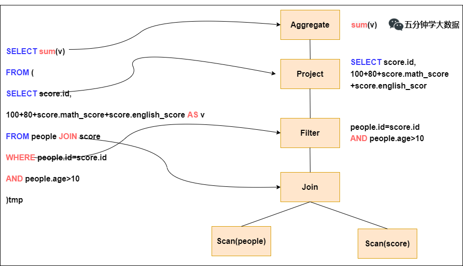 Analyzer会再次遍历整个语法树,对树上的每个节点进行数据类型绑定及函数绑定,比如people词素会根据元数据表信息解析为包含age、id以及name三列的表,people.age会被解析为数据类型的int的变量,sum被解析为特定的聚合函数。