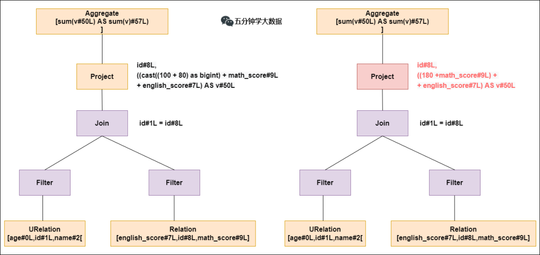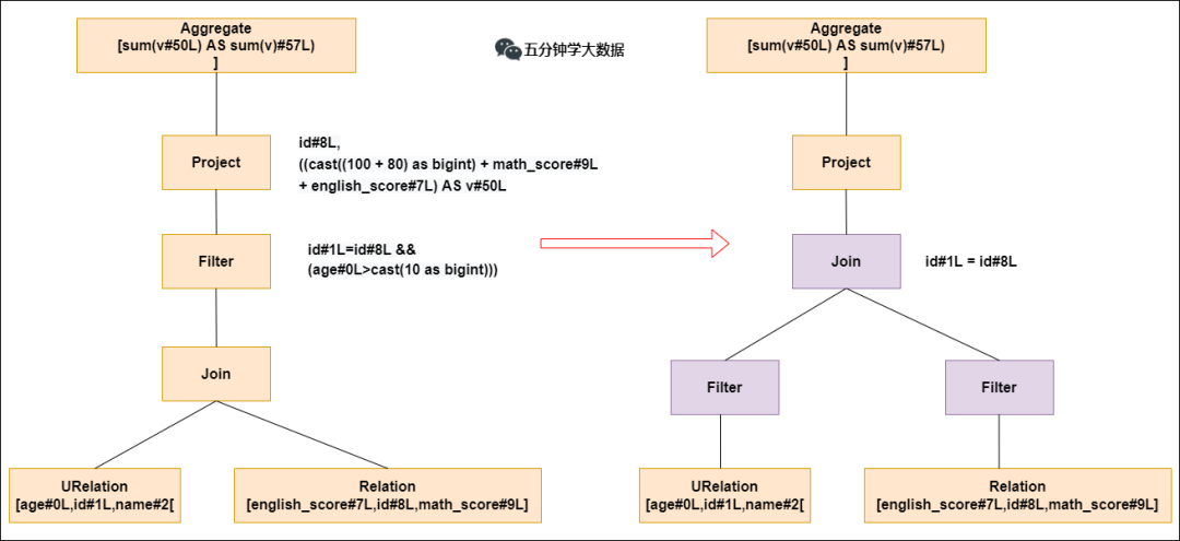 上图左边是经过解析后的语法树,语法树中两个表先做join,之后在使用age>10进行filter。join算子是一个非常耗时的算子,耗时多少一般取决于参与join的两个表的大小,如果能够减少参与join两表的大小,就可以大大降低join算子所需的时间。