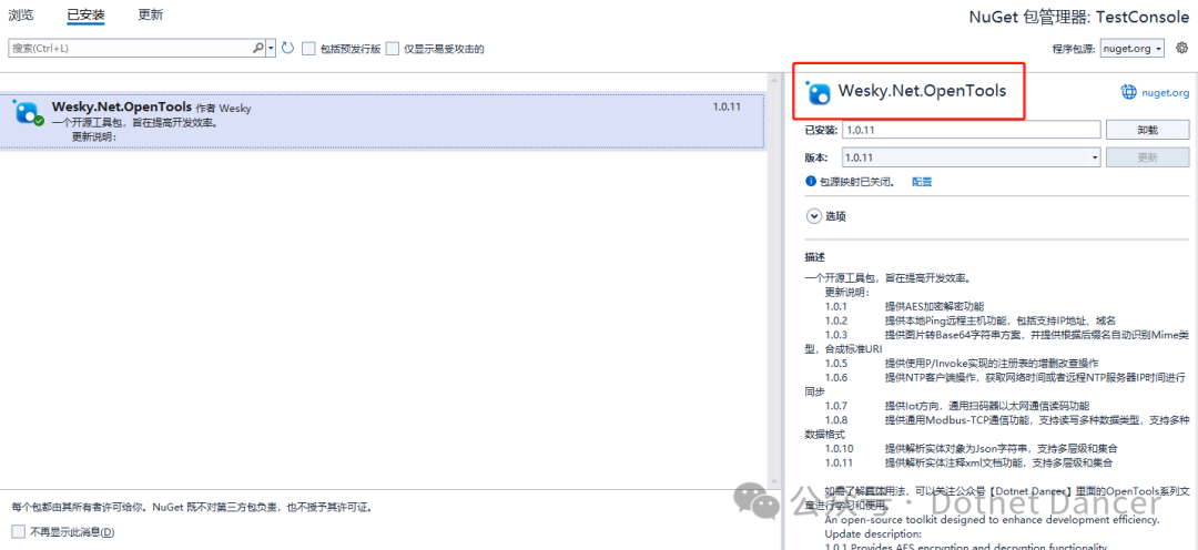 要引用 Wesky.Net.OpenTools 包,保持1.0.11版本或以上
