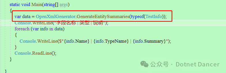 以上只是简单演示,你也可以用来快速生成实体类说明文档。例如:通过反射,获取所有类型,然后进行代入,解析出每个类型里面的属性以及注释,直接就是你的一个实体说明文档了。