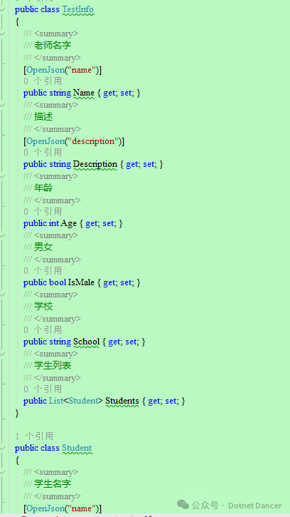 /// <summary>/// 生成给定类型的所有属性的摘要信息列表,搜索所有相关XML文档。/// Generates a list of summary information for all properties of a given type, searching through all relevant XML documents./// </summary>/// <param name="type">要分析的类型。The type to analyze.</param>/// <param name="parentPrefix">处理属性路径时用于嵌套属性的前缀。Prefix for nested properties to handle property paths correctly.</param>/// <returns>摘要信息实体列表。A list of summary information entities.</returns>public static List<DynamicSumaryInfo> GenerateEntitySummaries(Type type, string parentPrefix = ""){var summaryInfos = new List<DynamicSumaryInfo>();IEnumerable<string> xmlPaths = GetAllXmlDocumentationPaths();foreach (string xmlPath in xmlPaths){if (File.Exists(xmlPath)){XDocument xmlDoc = XDocument.Load(xmlPath);XElement root = xmlDoc.Root;summaryInfos.AddRange(ExtractSummaryInfo(type, root, parentPrefix));}}return summaryInfos;}/// <summary>/// 获取当前执行环境目录下所有XML文档的路径。/// Retrieves the paths to all XML documentation files in the current execution environment directory./// </summary>/// <returns>所有XML文档文件的路径列表。A list of paths to all XML documentation files.</returns>private static IEnumerable<string> GetAllXmlDocumentationPaths(){string basePath = AppContext.BaseDirectory;return Directory.GetFiles(basePath, "*.xml", SearchOption.TopDirectoryOnly);}/// <summary>/// 从XML文档中提取指定类型的所有属性的摘要信息。/// Extracts summary information for all properties of a specified type from an XML document./// </summary>/// <param name="type">属性所属的类型。The type to which the properties belong.</param>/// <param name="root">XML文档的根元素。The root element of the XML document.</param>/// <param name="parentPrefix">属性的前缀路径。The prefix path for properties.</param>/// <returns>摘要信息实体列表。A list of summary information entities.</returns>private static List<DynamicSumaryInfo> ExtractSummaryInfo(Type type, XElement root, string parentPrefix){var infos = new List<DynamicSumaryInfo>();foreach (PropertyInfo property in type.GetProperties()){string fullPath = string.IsNullOrEmpty(parentPrefix) ? property.Name : $"{parentPrefix}.{property.Name}";string typeName = property.PropertyType.Name;if (property.PropertyType.IsClass && property.PropertyType != typeof(string)){Type propertyType = property.PropertyType;if (propertyType.IsGenericType && propertyType.GetGenericTypeDefinition() == typeof(List<>)){propertyType = propertyType.GetGenericArguments()[0];typeName = $"List<{propertyType.Name}>";}infos.AddRange(GenerateEntitySummaries(propertyType, fullPath));}else{string summary = GetPropertySummary(root, type, property);infos.Add(new DynamicSumaryInfo{Name = fullPath,TypeName = typeName,Summary = summary ?? string.Empty});}}return infos;}