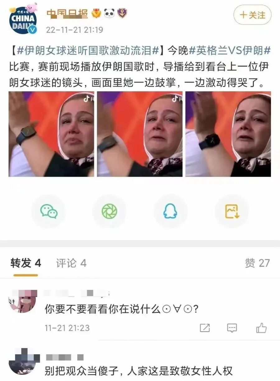 但最关键的“伊朗球员无动于衷”给省略了。