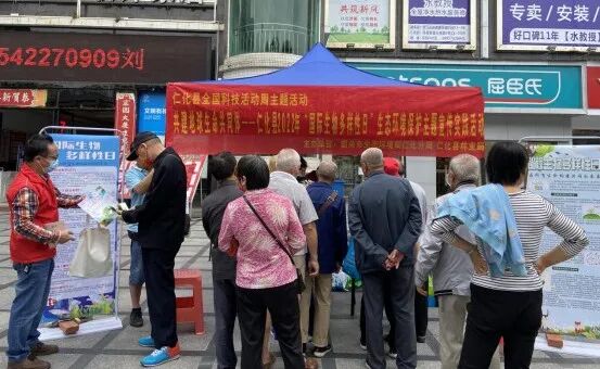 仁化分局志愿者通过宣传展板向群众普及生物多样性相关知识。