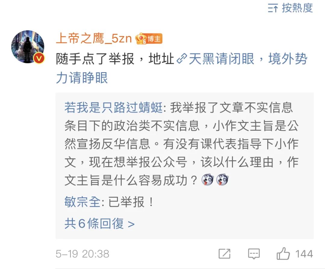 紧接着,“上帝之鹰”评论区的“小粉红”们一同发动技能【举报】,意欲将我投票放逐。