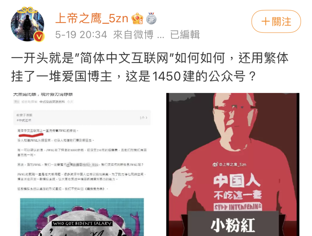 由于我在文案中使用了“简体中文互联网”一词,并在图片中使用了繁体字,“上帝之鹰”及其拥趸坚持认为我是“1450”——即台湾网军。