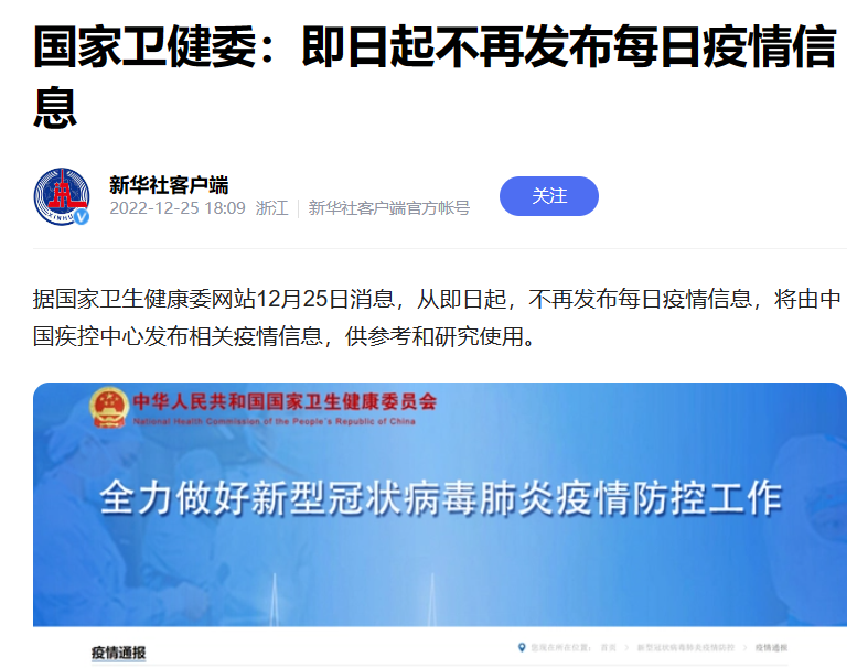 也不知道是我的文章起了作用,还是他们实在编不下去了,总之他们决定不装了。国家卫健委宣布,自2022年12月25日起,停止发布每日疫情数据。
