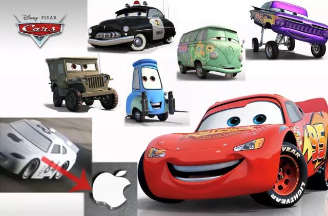 在其他作品中也有所体现,比如《赛车总动员》里惊现苹果logo: