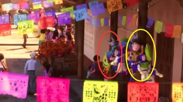 在热闹的集市里,挂着一大串Piñata。Piñata是一种墨西哥传统玩具,用彩色纸或布缝成各种形状,里面塞满糖果和玩具。只要你认真观察,会惊喜的发现《怪兽电力公司》的大眼仔和《玩具总动员》的巴斯光年和胡迪。