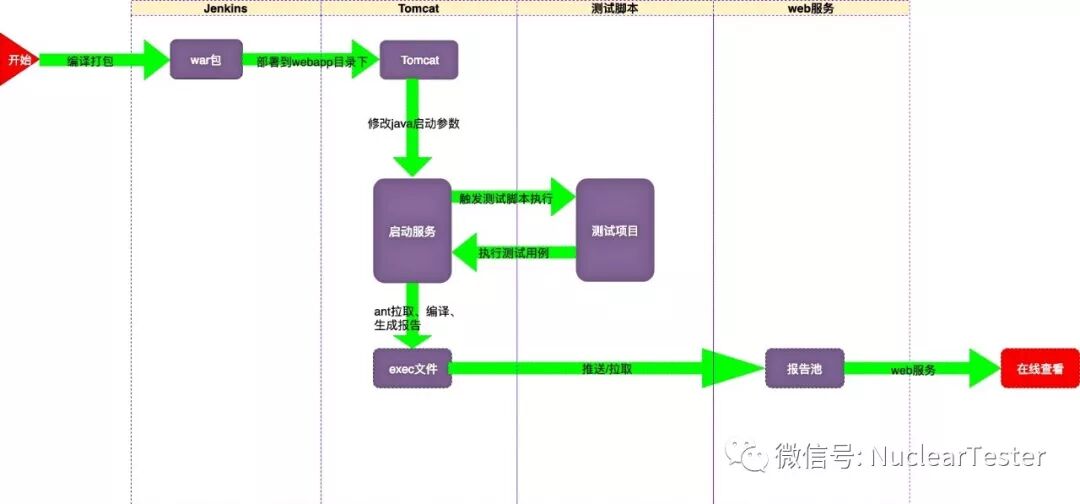 第一次画流程图,有点乱,这里在介绍一下思路,通过服务所在的Tomcat容器的启动脚本(JAVA_OPTS参数)引入jacoco配置,然后启动服务,通过ant配置build.xml读取exec的信息编译并生成报告(html格式)。最后使用web服务来查看相关报告。