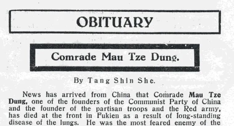 「因長期患肺結核而在福建前綫逝世」(這篇錯誤的「訃告」竟是共產國際刊物上的第一篇毛的生平介紹,《國際新聞通訊》英文版,1930