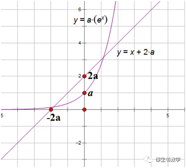 下面我们来分析题目。首先提个问题,这是个什么函数?先看它的组成,有指数函数和一次函数。指数函数和一次函数都是我们常见的基本函数。这个函数由指数函数和一次函数加减组合而成,我们不妨称之为“组合函数”。题干给出的条件是这个函数有两个零点。看到零点首先想到的是什么?函数与x轴的交点或者两个函数的交点。这样的话,我们必须画出f(x)的图像,用数形结合的办法。令h(x)=aex,g(x)=x+2a.由函数f(x)=aex-x-2a有两个零点我们可以知道h(x)与g(x)有两个交点。参照三角函数,我们知道h(x)=aex是基本函数y=ex的幅度变换,可能单增,也可能单减,由a的符号决定。g(x)=x+2a是个简单的一次函数,单调递增,截距为2a.通过分类讨论和排除法,我们最终可得如下图像。