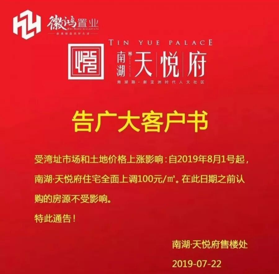 7月份,芜湖县南湖天悦府宣布涨价:受湾址市场和土地价格上涨影响,自2019年8月1号起,南湖天悦府住宅全面上调100元/㎡。在此日期之前认购的房源不受影响。