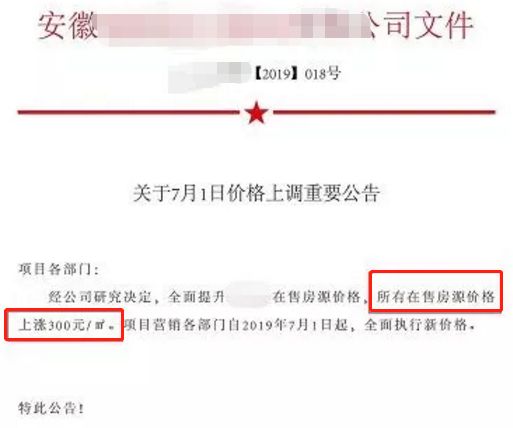 前段时间,滁州也有房企发布公告,宣布全面提升所有在售房源价格:经公司研究决定,所有在售房源价格上涨300元/㎡,项目营销各部门自2019年7月1日起,全面执行新价格!