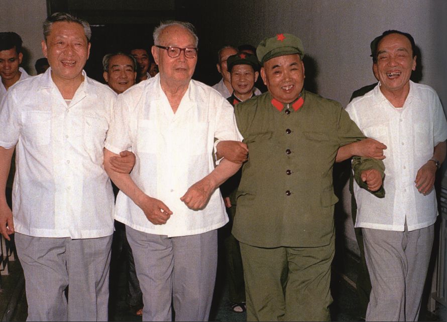 1979年6月,广东省委召开三级干部会议,习仲勋传达了中央同意广东在改革开放中先走一步的请求。习仲勋、叶剑英、许世友和杨尚昆(从左至右)手挽手来到与会者中间。