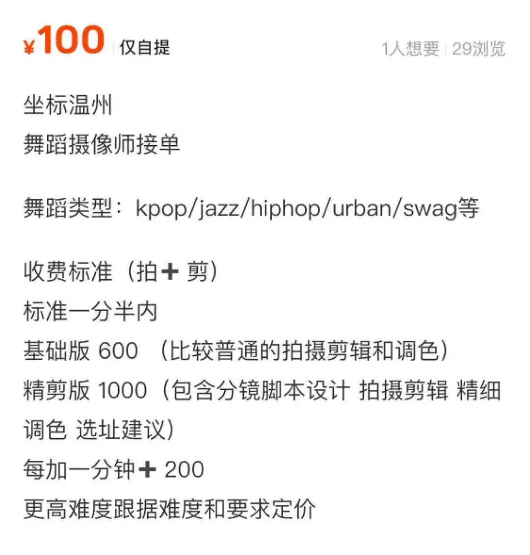 以前发个舞蹈室对镜自拍就能收获很多赞,现在日常视频站不到C位没人看、视频拍摄没有运镜没人看,乃至已经有一门职业正在兴起,就是帮跳韩舞的人拍单人cut的舞蹈摄像师。
