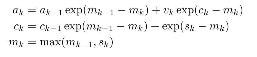 其中分子为 ,分母为 。将注意力视为 ,可以在 k=1,...,N 时,以滚动求和的方式迭代计算 和 。然而,在实践中,这种实现方式并不稳定,会因有限的精度表示和可能非常小或非常大的指数(即 ) 而遇到数值问题。为了缓解这一问题,作者用累积最大值项 来重写递推公式,计算 和 。通过从 a_(k-1)、c_(k-1) 和 m_(k-1) 对 a_k、c_k 和 m_k 的循环计算进行封装,作者引入了一个 RNN 单元,它可以迭代计算注意力的输出(见图 2)。注意力的 RNN 单元以(a_(k-1), c_(k-1), m_(k-1), q)作为输入,并计算(a_k, c_k, m_k, q)。注意,查询向量 q 在 RNN 单元中被传递。注意力 RNN 的初始隐藏状态为 (a_0, c_0, m_0, q) = (0, 0, 0, q)。计算注意力的方法:通过将注意力视为一个 RNN,可以看到计算注意力的不同方法:在 O (1) 内存中逐个 token 循环计算(即顺序计算);或以传统方式计算(即并行计算),需要线性 O (N) 内存。由于注意力可以被看作是一个 RNN,因此计算注意力的传统方法也可以被看作是计算注意力多对一 RNN 输出的高效方法,即 RNN 的输出以多个上下文 token 为输入,但在 RNN 结束时只输出一个 token(见图 1a)。最后,也可以将注意力计算为一个逐块处理 token 的 RNN,而不是完全按顺序或完全并行计算,这需要 O (b) 内存,其中 b 是块的大小。将现有的注意力模型视为 RNN。通过将注意力视为 RNN,现有的基于注意力的模型也可以被视为 RNN 的变体。例如,Transformer 的自注意力是 RNN(图 1b),上下文 token 是其初始隐藏状态。Perceiver 的交叉注意力是 RNN(图 1c),其初始隐藏状态是与上下文相关的潜变量。通过利用其注意力机制的 RNN 形式,这些现有模型可以高效地计算其输出存储。然而,当将现有的基于注意力的模型(如 Transformers)视为 RNN 时,这些模型又缺乏传统 RNN(如 LSTM 和 GRU)中常见的重要属性。值得注意的是,LSTM 和 GRU 能够仅在 O (1) 常量内存和计算中使用新 token 有效地更新自身,相比之下, Transformer 的 RNN 视图(见图 1b)会通过将一个新的 token 作为初始状态添加一个新的 RNN 来处理新 token。这个新的 RNN 处理所有先前的 token,需要 O (N) 的线性计算量。在 Perceiver 中,由于其架构的原因,潜变量(图 1c 中的 L_i)是依赖于输入的,这意味着它们的值在接收新 token 时会发生变化。由于其 RNN 的初始隐藏状态(即潜变量)发生变化,Perceiver 因此需要从头开始重新计算其 RNN,需要 O (NL) 的线性计算量,其中 N 是 token 的数量,L 是潜变量的数量。 针对这些局限性,作者建议开发一种基于注意力的模型,利用 RNN 公式的能力来执行高效更新。为此,作者首先引入了一种高效的并行化方法,将注意力作为多对多 RNN 计算,即并行计算 的方法。为此,作者利用并行前缀扫描算法(见算法 1),这是一种通过关联算子 从 N 个连续数据点计算 个前缀的并行计算方法。该算法可高效计算 from 。为此,作者提出了以下关联算子 ,该算子作用于形式为 的三元组,其中 是一组索引,, , 。并行扫描算法的输入为 。该算法递归应用算子 ,其工作原理如下:![]()