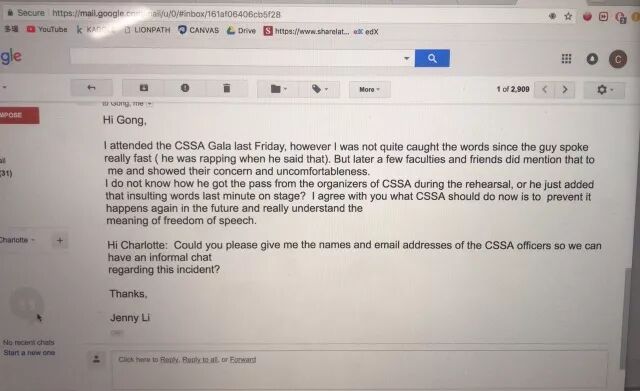 其中1封邮件,是美籍华裔教授Gong发给同校另一位美籍华裔教授Jenny和相关工作人员Charlotte的,内容如下: