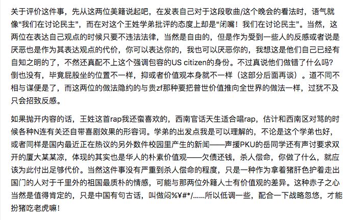 如果是美国人,那么我的言语中如果有冒犯,会礼节性的做一个解释:这是说唱表演形式,做不得真。但得知两位老师其实是中国人,我就莫名的有点不舒服,甚至感到愤怒。