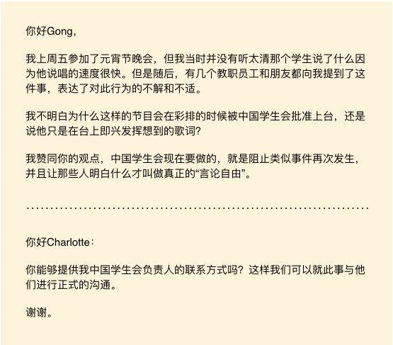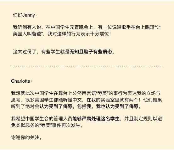 晚会结束后,两名美籍华裔教授向节目主办方发出控告邮件,用较强硬的措辞批判了王同学的行为,并希望能够“严肃处理”。