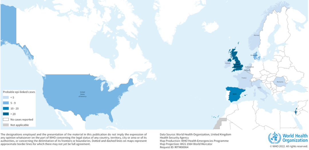 截至22日报告的169例中,包括英国114例,西班牙13例,以色列12例,美国9例,丹麦6例,爱尔兰<5例,荷兰4例,意大利4例,挪威2例,法国2例,罗马尼亚1例,比利时1例。