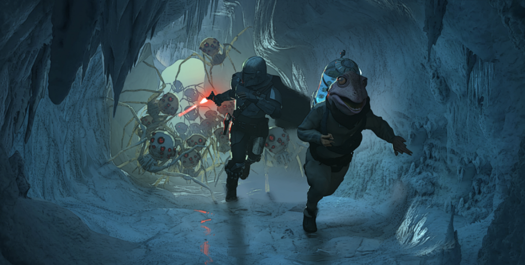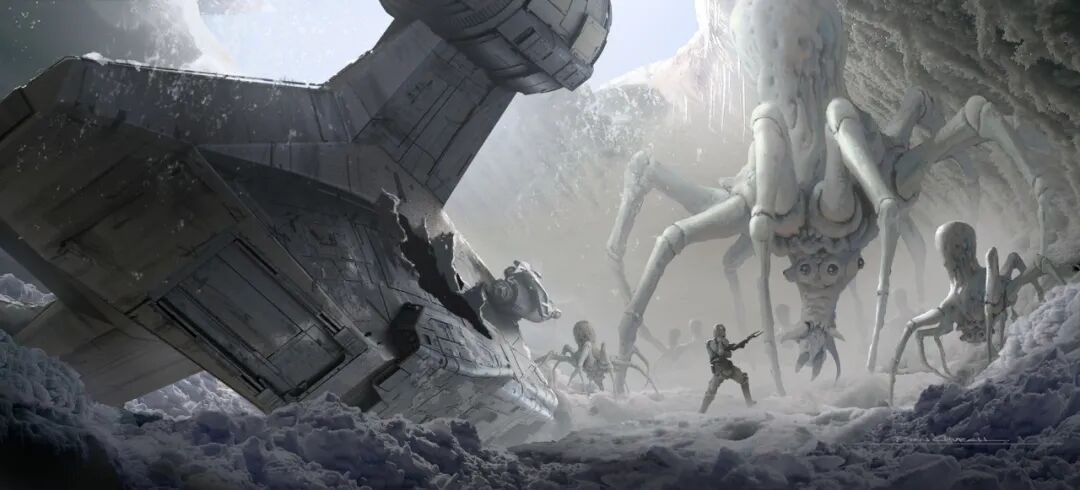 第二集的The Passenger更是令人印象深刻。丁贾林做好人好事送“女蛙娘娘”去见老公,谁知半路乱入“盘丝洞”,这里就不放截图了(太恶心),放张概念图大家感受一下。攻击Mando他们的蜘蛛生物原型是基于Ralph McQuarrie为星战正传第二部《帝国反击战》设定的概念,虽然后来未被使用。这个生物设定颇有异形的影子,而《异形》(1979年)正是在《帝国反击战》(1980年)的前一年上映。这一集由《蚁人》的导演Peyton Reed执导,这位昆虫之友将这集完成得非常不错,精彩程度可以排在本季前三了。另外,这集中还有尤达宝宝偷蛋吃的经典镜头,可爱满分!