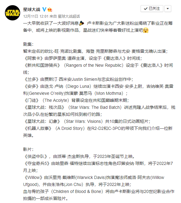 由于《曼达洛人》系列的成功,卢卡斯影业总裁凯瑟琳·肯尼迪表示,将继续拍摄衍生剧,开启一个全新的“星球大战”时代,讲述遥远星系中更久远的历史。根据迪士尼上周所公布的星战系列未来计划,两部全新的衍生剧《阿索卡·塔洛》和《新共和国游骑兵》将在明年圣诞季上线Disney+流媒体平台。