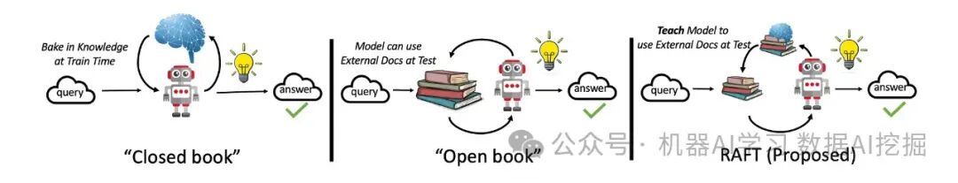 RAFT通过在模拟的不完美检索场景中参考文档,结合了带有问题-答案对的微调。这种方法有效地为模型准备了开卷考试。