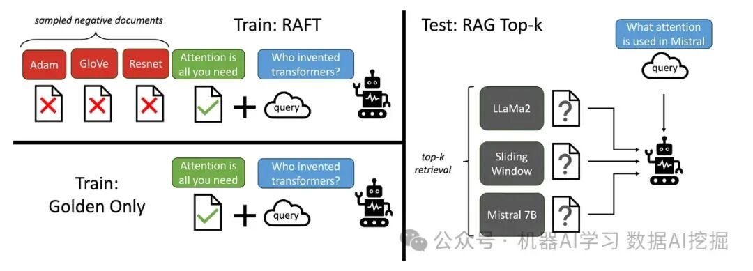参考上图,RAFT方法是一种适应LLMs的方法,用于从正面和负面文档集合中阅读解决方案。