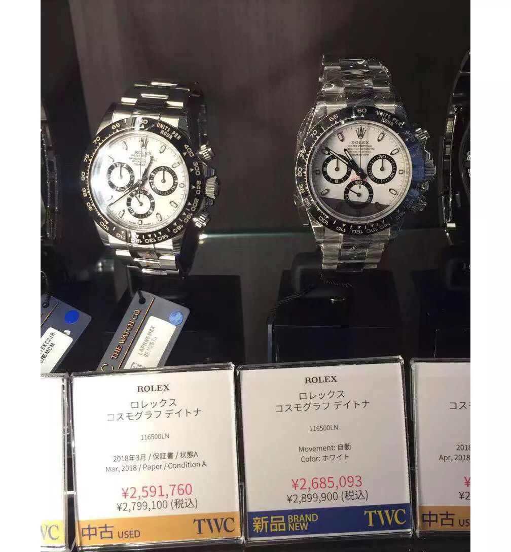 几家店一做比较,就会发现,龟吉的价格不算贵,比如以热门款劳力士熊猫迪为例,兔子看到现场陈列了3块,状态和价格都有差异。最便宜的一块是已撕膜的,147000元。有膜的会贵不少,表来自欧洲或日本,价格也不同(有并行货存在,税不同,自然价格不一样,而日本并行是合法的)。