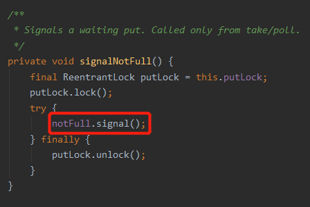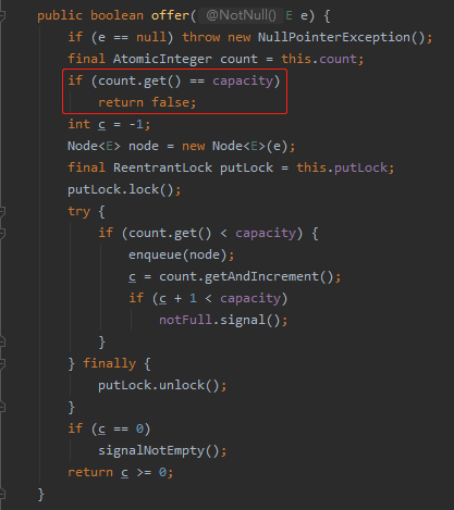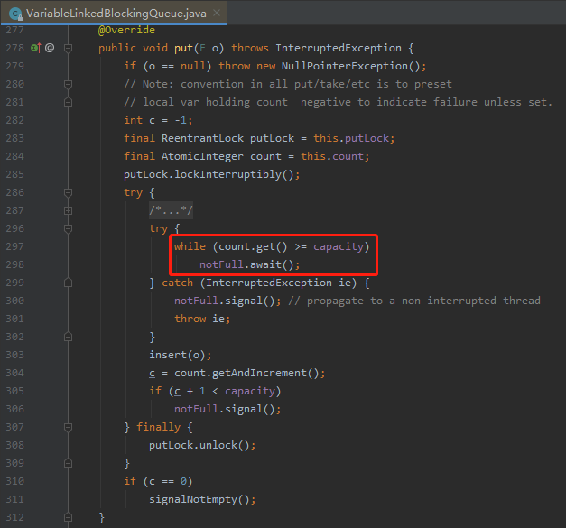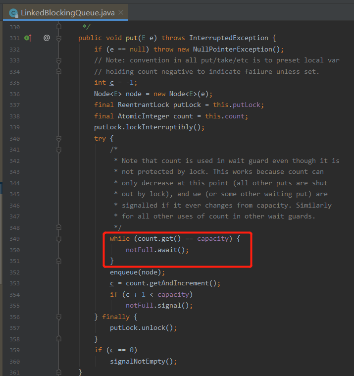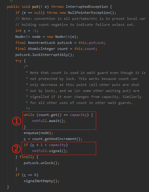 count.get == capacity 就是说队列已经满了,然后执行 notFull.await() 把当前的这个 put 操作挂起来。