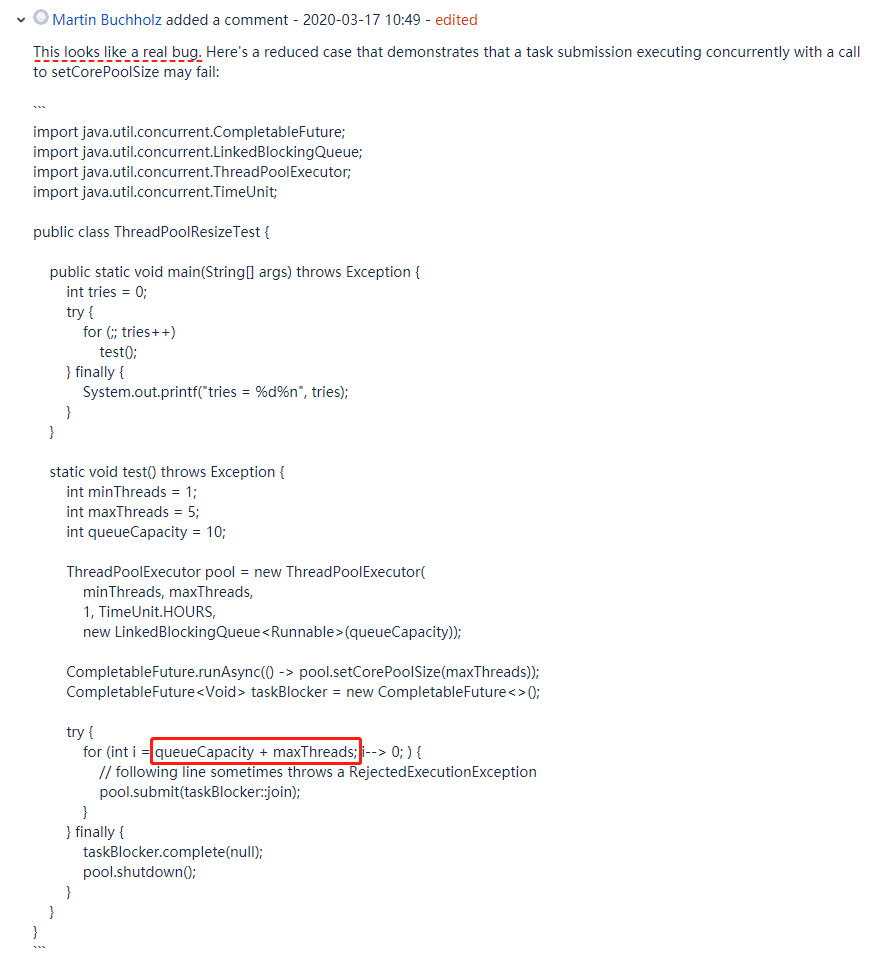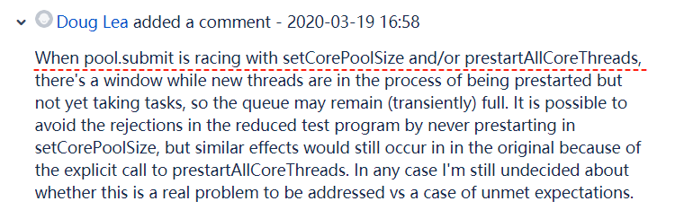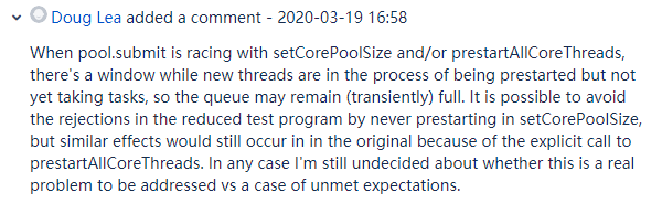 他说当线程池的 submit 方法和 setCorePoolSize 或者 prestartAllCoreThreads 同时存在,且在不同的线程中运行的时候,它们之间会有竞争的关系。