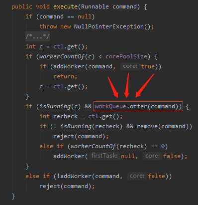 而这个情况下,另外的任务通过线程池提交进来后,发现队列还有位子,就放到队列里面去了,根本不会去执行 addWorker 方法。